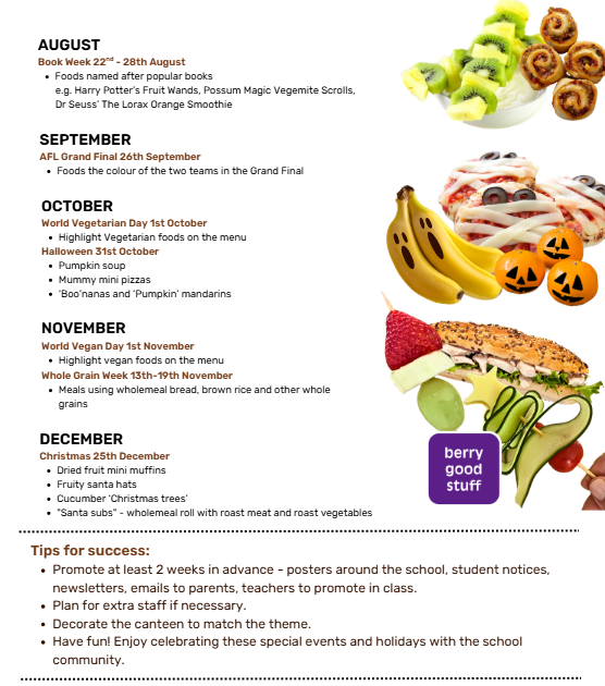 Included are ideas for nutritious food and drink items you can sell in your canteen to celebrate these special days with your school community.